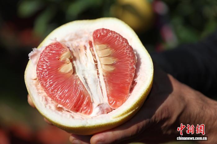 11月19日,江西上饶,剥启的马家柚果肉玫白似番茄,汁火敷裕似西瓜,明亮晶莹似好玉。中新社记者 刘占昆 摄
